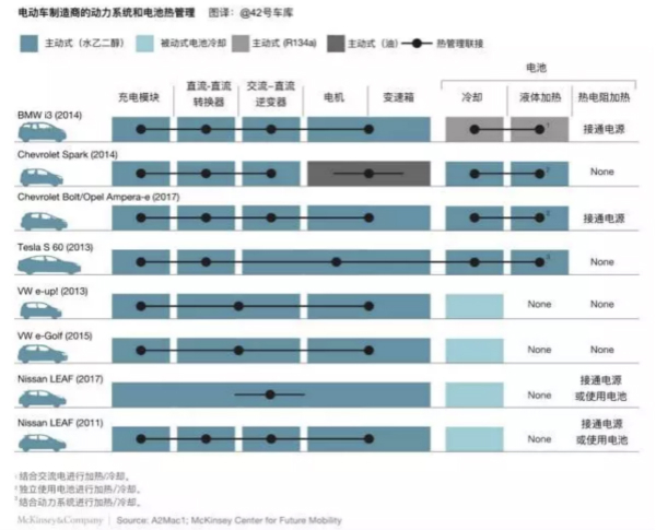 我們也發現了熱管理的設計方法有著巨大的區別,比如電池冷卻系統就有四種不同的方案:被動式(自然風冷),主動式結合動力系統的,主動式獨立用于電池的,主動式結合空調電路的。