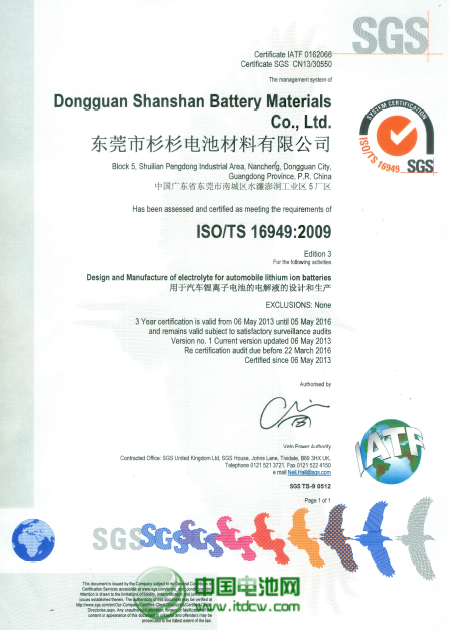 近日,東莞市電池材料有限公司(電解液)已通過ISO/TS16949認證,據悉,該認證的獲得是東莞杉杉在汽車電池材料發展史上一個重要里程碑,標志著東莞杉杉的電解液產品品質已經走在全球最前沿,也再次印證了東莞杉杉電解液在新能源汽車電池材料領域的技術領導地位。