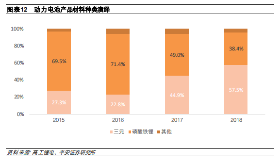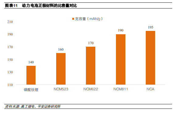2) 三元鋰離子電池中添加鎳元素可以提升正極材料的比容量,目前三元鋰離子電池 NCM523 裝機量占比最大,但是未來鎳含量更高的NCM622、NCM811 電池占比將逐步提升。