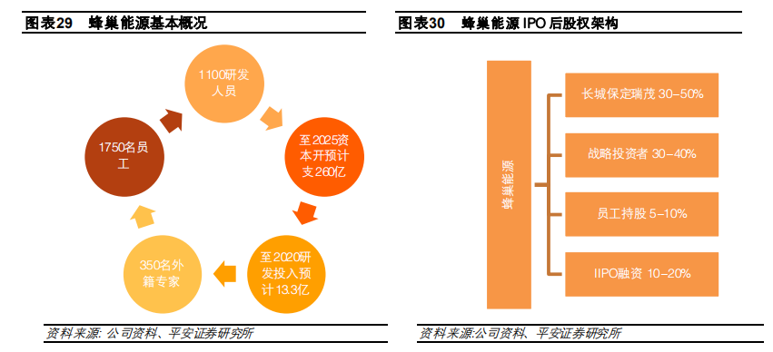 長(zhǎng)城汽車(chē)于2012年成立動(dòng)力電池項(xiàng)目組,2016年動(dòng)力電池事業(yè)部成立,2018年蜂巢能源正式成立,從事動(dòng)力電池核心材料、電芯、模組、PACK、BMS、儲(chǔ)能、太陽(yáng)能的專(zhuān)業(yè)研發(fā)和制造,現(xiàn)有研發(fā) 人員 1100 人左右,研發(fā)費(fèi)用 2016-2020 年 5 年投入約 30 億,到 2025 年,蜂巢將投入使用美國(guó)、京津冀、韓國(guó)、日本、上海、無(wú)錫和印度 7 大研發(fā)中心。