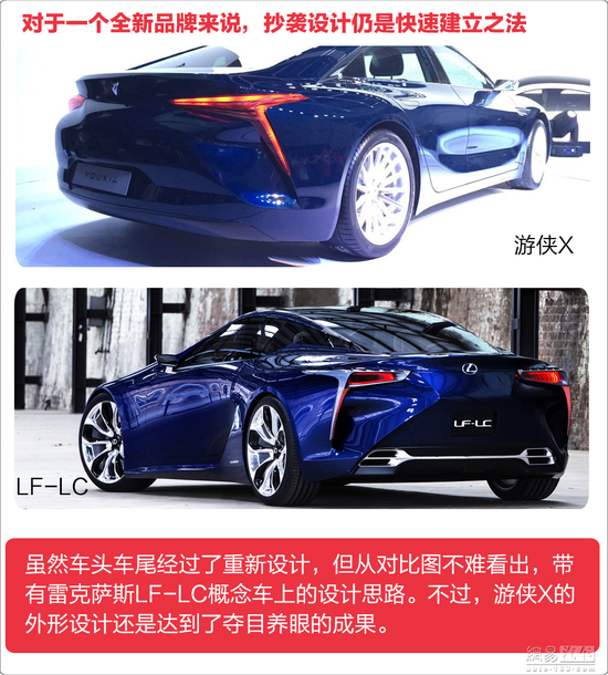 毫無疑問,游俠X電動車在設計工程上,是徹徹底底逆向開發自特斯拉MODEL S。雖然為躲避抄襲之唾罵聲,按照慣例在車頭車尾的設計上融入了自己的想法,但從相近車身尺寸、近乎一致的側面造型和以假亂真的內飾上不難看出,這無疑就是特斯拉的中國翻版,有著濃重的臨摹痕跡。乃至可跳出的隱藏式車門把手都與MODEL S如出一轍,即便是完全不同于MODEL S的車尾,也能夠看到雷克薩斯在LF-LC概念車上的筆觸。