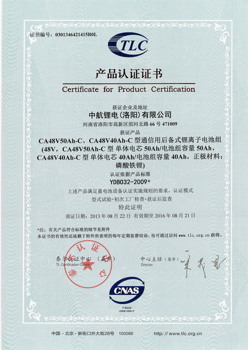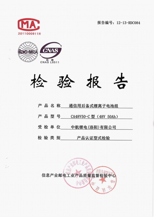 8月30日,中航鋰電成功獲得CA48V50Ah-C、CA48V40Ah-C型通信用后備式鋰離子電池組泰爾認證證書,這標志著公司CA48V50Ah-C、CA48V40Ah-C型通信用后備式鋰離子電池組獲得通信行業國家級認可,為公司開拓通信行業市場奠定了堅實基礎。