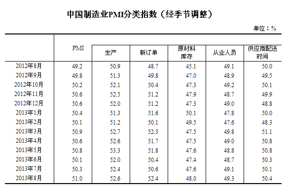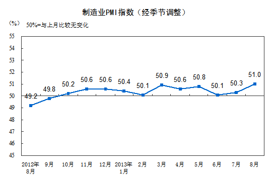 2013年8月,中國制造業(yè)采購經(jīng)理指數(shù)(PMI)為51.0%,比上月上升0.7個百分點(diǎn),連續(xù)11個月位于臨界點(diǎn)以上。