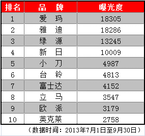 此次統計的數據是對各品牌整個第三季度的媒體曝光度、用戶關注度和產品關注度三個方面進行的綜合考評,動態評估了各品牌在行業內的口碑及各自影響力的變化。