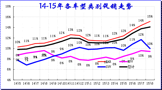 從各車型類別的促銷走勢(shì)看,在14年3-12月總體促銷幅度逐步增大。15年的1-2月的收縮力度幅度較小,隨后4-8月轎車促銷增大較多。MPV大類車型的促銷增長(zhǎng)較平穩(wěn)。SUV的促銷力度2-4月加大,5月因新款降價(jià)稍有走穩(wěn),6-8月的SUV促銷迅速加大。