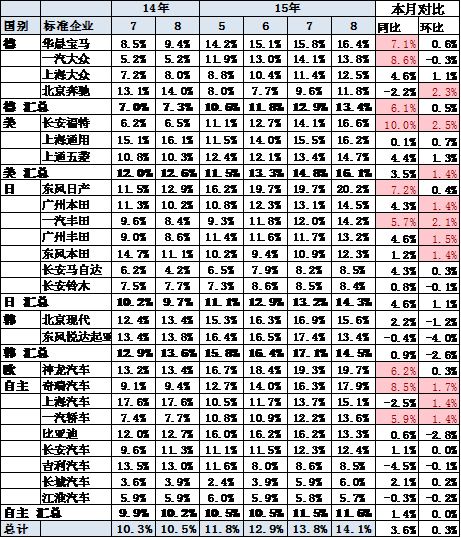 15年8月的車市受到大眾和通用的同比下滑而其他車系表現(xiàn)較強(qiáng)。近期日系份額明顯回升,本田和豐田等份額表現(xiàn)較強(qiáng),福特表現(xiàn)一般。自主上升走勢(shì)也減弱。