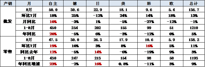 8月的批發(fā)增速差距也較大,自主品牌的增速在高增速區(qū)間,日系8月的批發(fā)增速24%較好。1-8月的歐美主力車系同比零增長(zhǎng),只有自主品牌較突出。
