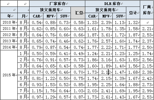 從庫(kù)存指數(shù)看,今年8月末的廠家?guī)齑孢_(dá)到0.87個(gè)月的銷量,今年的廠家?guī)齑嫔疃鹊陀跉v年8月的正常水平。經(jīng)銷商庫(kù)存降至1.67個(gè)月水平,較前兩年的1.75左右相對(duì)偏低。由于市場(chǎng)巨變的低迷,8月的廠商庫(kù)存合計(jì)是2.53個(gè)月,屬于總體庫(kù)存較合理的水平。