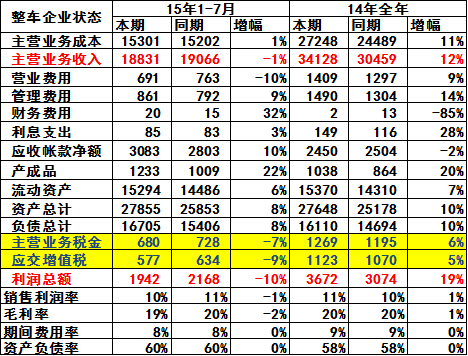 由于國(guó)家統(tǒng)計(jì)局的行業(yè)經(jīng)濟(jì)運(yùn)行的總體數(shù)據(jù)發(fā)布要晚一個(gè)多月,因此我們本月只能進(jìn)行隔月的月度跟蹤汽車整車總體運(yùn)行狀態(tài)。國(guó)家統(tǒng)計(jì)局統(tǒng)計(jì)的14年的主營(yíng)業(yè)務(wù)收入3.4萬億元,增長(zhǎng)12%,而成本增長(zhǎng)11%,生產(chǎn)運(yùn)營(yíng)處于較好水平。但15年的1-7月的收入增長(zhǎng)-1%,成本增長(zhǎng)1%,利潤(rùn)下降10%,總體看汽車整車行業(yè)的利潤(rùn)表現(xiàn)下滑較大,其中的稅收1257億元增長(zhǎng),出現(xiàn)大幅下滑106億元。而14年的汽車行業(yè)稅收是增長(zhǎng)128億元,可見15年1-7月的稅收下滑是極其劇烈的。