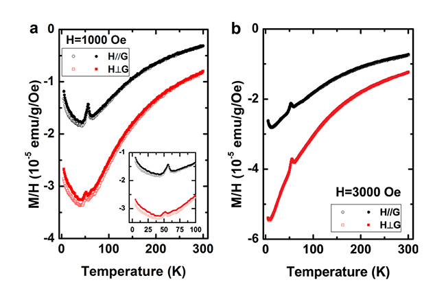 圖1 有序排列的石墨烯樣品在一定場強下磁化率隨溫度的變化。