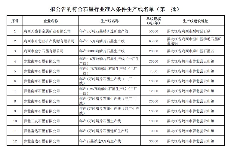 根據《石墨行業準入條件》和《石墨行業準入公告管理暫行辦法》,經企業申報、省級工業和信息化主管部門核實推薦和專家復核,現將擬公告的符合石墨行業準入條件生產線名單(第一批)予
