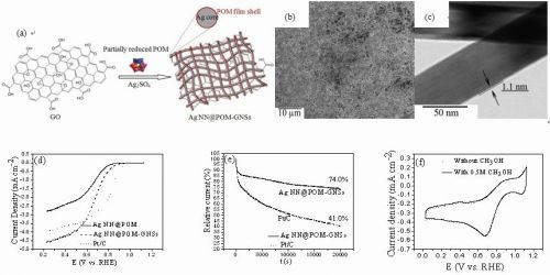 (a) Ag NN@POM-GNSs納米復合材料制備示意圖,(b) Ag NN@POM-GNSs納米復合材料SEM照片,(c) Ag NN@POM-GNSs納米復合材料TEM照片,(d) ORR線性掃描伏安曲線對比,(e) 穩定性能測試,(f) Ag NN@POM-GNSs修飾電極抗甲醇干擾性能