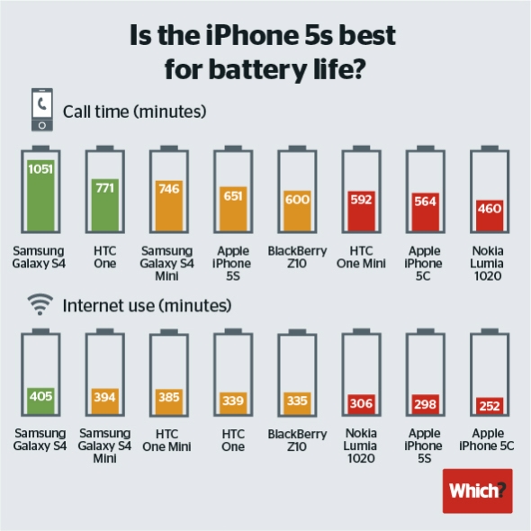 具體成績方面,通話測試中三星Galaxy S4電池可續(xù)航1051分鐘,雄居第一;HTC One電池續(xù)航771分鐘,位居第二;三星Galaxy S4 mini為746分鐘,位居第三;而位居第四的iPhone 5S電池續(xù)航僅為651分鐘,比三星S4足足短了7個小時;黑莓Z10和HTC One mini分別位居第五和第六;iPhone5C僅位列第七,電池續(xù)航564分鐘。
