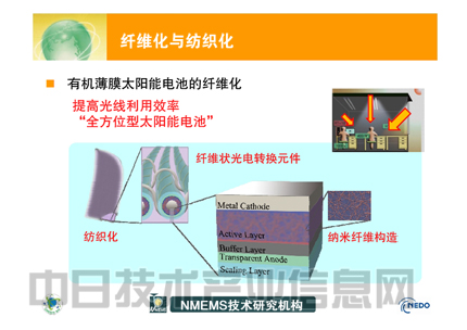 為了實現在昏暗的室內也能高效發電、成本僅為1000日元的“粘貼型傳感器”,柔性太陽能電池的開發正在進行之中。將把采用可降低成本的有機半導體制造的薄膜太陽能電池制成nm(10-9m)級微細纖維狀,再編織成“布”。計劃將這種太陽能電池用于植物工廠。日本NMEMS技術研究機構綠色傳感器網絡研究所大岡山研究中心主任谷岡明彥以《傳感器網絡系統中納米纖維獨立電源的開發》為題發表演講,介紹了這種太陽能電池的開發詳情。
