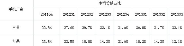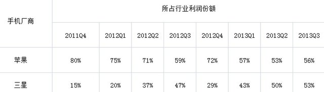 從表二數(shù)據(jù)可以看出,雖然今年HTC、諾基亞等手機(jī)廠商陸續(xù)推出旗艦機(jī),但并沒有改變蘋果、三星兩雄爭(zhēng)霸的格局,所獲得的利潤(rùn)空間也并沒有過多的改善。從2011年第四季度開始,蘋果、三星就牢牢控制住了整個(gè)行業(yè)90%以上的利潤(rùn)份額,并從2012年開始,一直穩(wěn)定在100%以上。