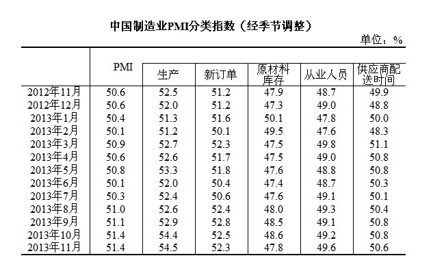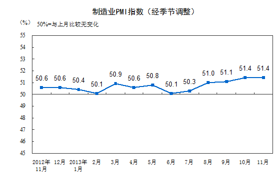 2013年11月,中國制造業(yè)采購經理指數(PMI)為51.4%,與上月持平,為2012年5月以來的高點,連續(xù)14個月位于臨界點以上,表明我國制造業(yè)繼續(xù)穩(wěn)中向好。