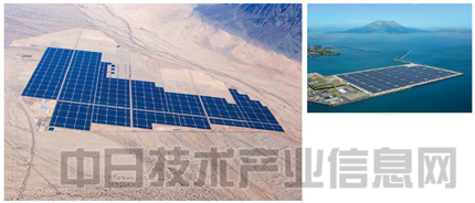 美國第一太陽能供應太陽能電池的加利福尼亞州發電站(左)。發電輸出功率為55萬千瓦,屬于全球最大級別。日本國內最大級別、輸出功率為7萬千瓦的鹿兒島市七島太陽能發電站。