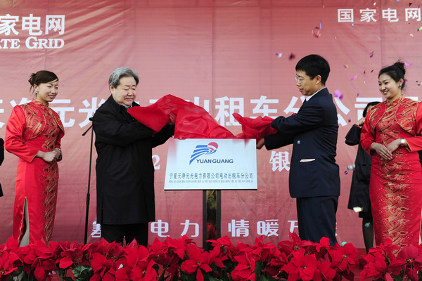 寧夏回族自治區黨委常委、自治區副主席齊同生與寧夏電力公司總經理崔吉峰共同為寧夏天凈元光電動出租車公司揭牌
