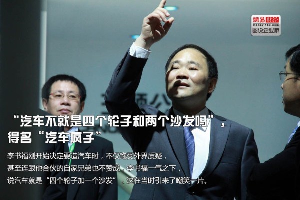 李書福剛開始決定要造汽車時,不僅飽受外界質疑,甚至連跟他合伙的自家兄弟也不贊成,李書福一氣之下,說汽車就是“四個輪子加一個沙發(fā)”,這在當時引來了嘲笑一片。