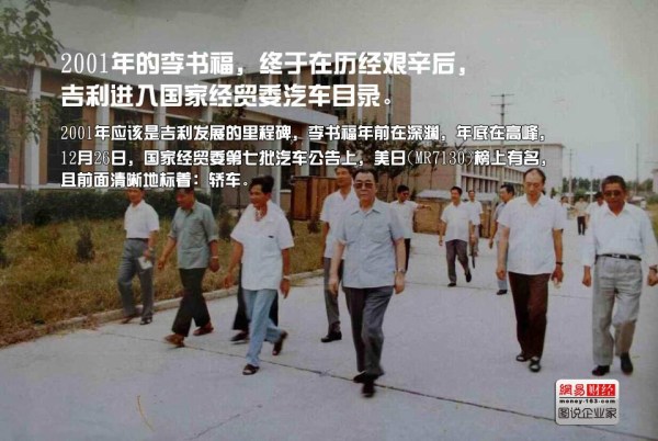 2001年應該是吉利發(fā)展的里程碑,李書福年前在深淵,年底在高峰,12月26日,國家經(jīng)貿委第七批汽車公告上,美日(MR7130)榜上有名,且前面清晰地標著:轎車。拿到牌照的李書福迅速受到了銀行的追捧, 2003年,光大銀行和上海銀行給吉利聯(lián)合貸款十億元,吉利進入了高速發(fā)展時期,迅速成為國內汽車企業(yè)“3+6”主流格局的成員之一,2005年5月10日,吉利在香港上市。