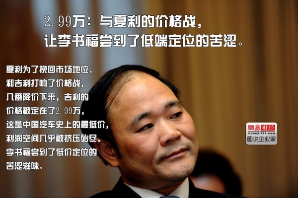 入市之后,吉利的競爭者是夏利、英格爾和奧拓。從1997年開始,各地的汽車交易市場上私人購車比率月月上升,吉利豪情上市后,一直以4萬多的價格占領著“中國最便宜的轎車”這樣一個有號召力的地位,夏利為了挽回市場地位,和吉利打響了價格戰(zhàn),幾番降價下來,吉利的價格被定在了2.99萬,這是中國汽車史上的最低價,利潤空間幾乎被擠壓殆盡,李書福嘗到了低價定位的苦澀滋味。
