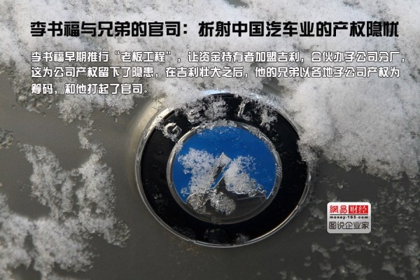 在吉利汽車早期,李書福拿不到許可證,就融不到資,只有向民間銀行貸款,為了解決資金問題,他推行“老板工程”,讓資金持有者加盟吉利,合伙辦子公司分廠,這為公司產(chǎn)權留下了隱患,在吉利壯大之后,他的兄弟以各地子公司產(chǎn)權為籌碼,和他打起了官司。
