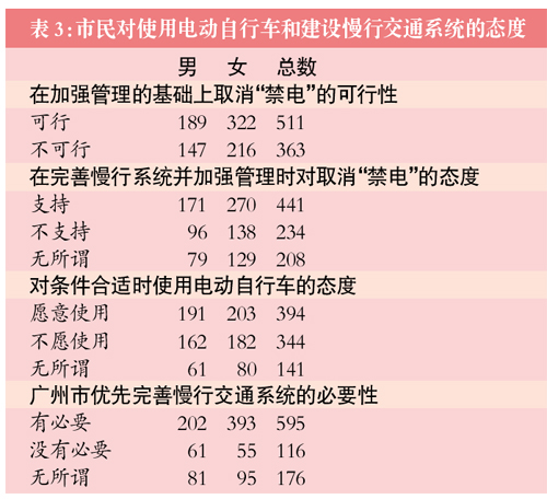 58.5%的市民認為在加強管理的基礎上取消“禁電”具有可行性;支持在完善慢行系統并加強管理時取消“禁電”措施的受調查者人數是不支持人數的1.9倍;愿意在條件合適時使用電動自行車的受調查者人數也多于不愿意的人數;認為廣州市有必要優先完善慢行交通系統的受調查者人數是認為沒有必要人數的5.1倍(表3)。