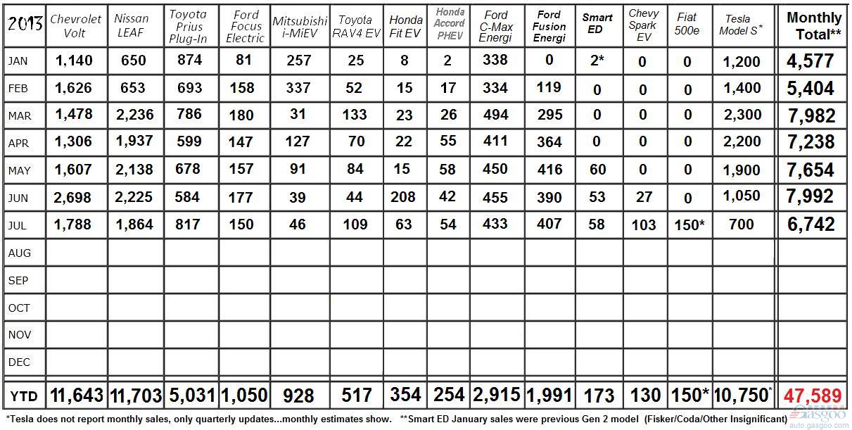 今年1到7月份,美國(guó)市場(chǎng)插電式電動(dòng)車銷量分別為4,577輛、5,404輛、7,982輛、7,238輛、7,654輛、7,992輛和6,742輛。從3月開始連續(xù)4個(gè)月超過7千輛,到上個(gè)月跌破該數(shù)值。