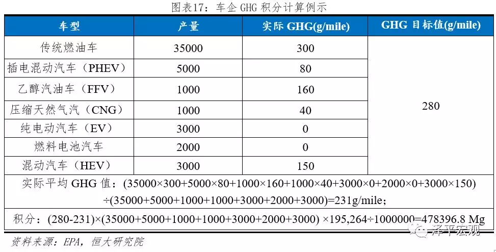 GHG標(biāo)準(zhǔn)采用積分制管理。EPA每年發(fā)布年度各車企GHG報(bào)告,對(duì)各車企積分進(jìn)行公示,產(chǎn)生負(fù)積分的企業(yè)需要購(gòu)買GHG正積分進(jìn)行沖抵。GHG積分=(GHG目標(biāo)值-GHG實(shí)際值)×產(chǎn)量×全生命周期里程÷1000000。其中全生命周期里程:乘用車為195264英里;積分單位:Mg(megagrams兆克)。假設(shè):車企A年產(chǎn)50000輛乘用車,各車型產(chǎn)量分布如下,則計(jì)算可得該年實(shí)際積分為:478396.8Mg。