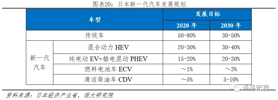 2020年、2030年新能源汽車分別占比15-20%、20-30%。2010年4月日本經(jīng)濟(jì)產(chǎn)業(yè)省發(fā)布《下一代汽車戰(zhàn)略2010》,將下一代汽車定義為:非插電式混合動(dòng)力汽車(HEV)、純電動(dòng)汽車(BEV)、插電式混合動(dòng)力汽車(PHEV)、燃料電池汽車(FCV)、清潔柴油汽車(CDV)等。并首次公告發(fā)展目標(biāo):到2020年,下一代汽車將在新車銷量中力爭(zhēng)達(dá)到20%~50%;到2030年,下一代汽車將在新車銷量中力爭(zhēng)達(dá)到50%~70%,并沿用至今。
