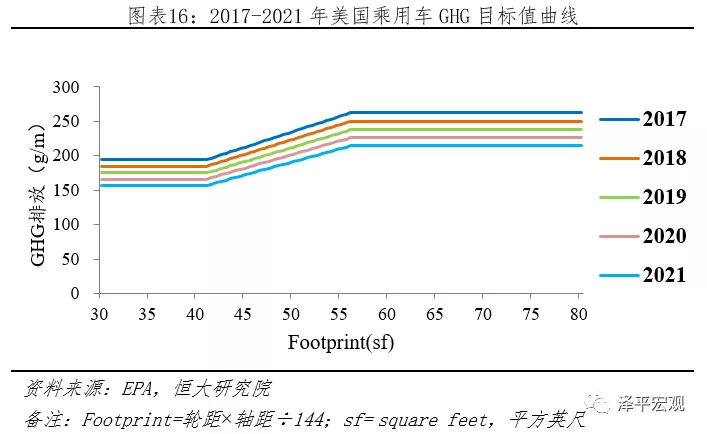 1)CAFE和GHG標(biāo)準(zhǔn):2010年5月,奧巴馬要求美國(guó)環(huán)保署(EPA)和美國(guó)公路安全管理局(NHTSA)根據(jù)《Clean Air Act》和《Energy Independence and Security Act of 2007》推行國(guó)家級(jí)2017-2025年輕型車項(xiàng)目,以提升CAFE和降低GHG排放。其中,EPA負(fù)責(zé)制定2017-2025年GHG標(biāo)準(zhǔn),NHTSA負(fù)責(zé)制定2017-2025年CAFE標(biāo)準(zhǔn)。GHG政策第一階段“2017-2021”標(biāo)準(zhǔn)已頒布,第二階段“2022-2025”標(biāo)準(zhǔn),因2018年4月2號(hào),特朗普政府指責(zé)過(guò)于嚴(yán)苛,影響就業(yè),需重新修改,新版本暫未公布。CAFE政策第一階段“2017-2021”標(biāo)準(zhǔn)已頒布,第二階段“2022-2025”標(biāo)準(zhǔn)中期評(píng)估中,暫未公布。CAFE與GHG相似處頗多:1)皆采用積分制,GHG排放低于目標(biāo)值可獲得正積分,反之負(fù)積分;2)其標(biāo)準(zhǔn)值皆是分車型、參考汽車占地面積“Footprint”為參考。以GHG標(biāo)準(zhǔn)為例,其2017-2021年乘用車目標(biāo)值曲線如下,對(duì)于不滿足GHG標(biāo)準(zhǔn)的車企,根據(jù)《Clean Air Act》第205條款,最高可單車罰款37500美元。