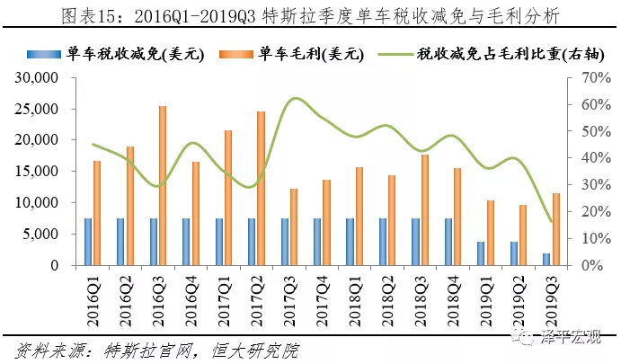據(jù)特斯拉財(cái)報(bào)披露,2019Q3公司汽車銷售毛利率21.78%,單車毛利11525.77美元,稅收減免占毛利比重16.27%,稅收減免取消后,預(yù)計(jì)降低毛利率3.54個(gè)百分點(diǎn)。