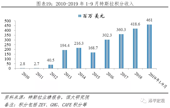 據(jù)特斯拉披露,2010-2019Q3特斯拉累計(jì)積分銷售收入21.68億美元,其中2016、2017、2018年,ZEV和非ZEV積分收入分別為2.15、0.87,2.80、0.81,1.03、3.15億美元。