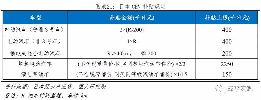 新能源財(cái)政補(bǔ)貼由經(jīng)濟(jì)產(chǎn)業(yè)省主導(dǎo),分為四類:1)節(jié)能車補(bǔ)貼;2)CEV(CleanEnergy Vehicle)導(dǎo)入補(bǔ)貼;3)充電設(shè)施補(bǔ)貼;4)加氫設(shè)備補(bǔ)貼。其中節(jié)能車補(bǔ)貼于2012年9月廢除,被CEV補(bǔ)貼取代;加氫設(shè)備補(bǔ)貼主要針對(duì)氫燃料電池,充電設(shè)施補(bǔ)貼主要針對(duì)充電樁,當(dāng)前新能源汽車主要推動(dòng)力在“CEV導(dǎo)入補(bǔ)貼”。