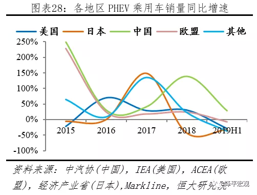 2019H1全球市場PHEV增速下滑,歐美EV、PHEV增速分化嚴重。2019H1新能源乘用車市場,據(jù)中汽協(xié)披露,中國EV、PHEV同比增速分別為69.9%、28.0%;據(jù)ACEA披露,歐盟EV、PHEV同比增速90.9%、-6.9%;據(jù)Markline披露,日本EV、PHEV同比增速-27.7%、-31.1%,美國EV、PHEV同比增速68.0%、-29.5%,其它地區(qū)EV、PHEV同比增速52.7%、-37.6%。按照上述統(tǒng)計,2019H1全球新能源乘用車市場,EV、PHEV同比增速分別為68.7%、-0.8%。