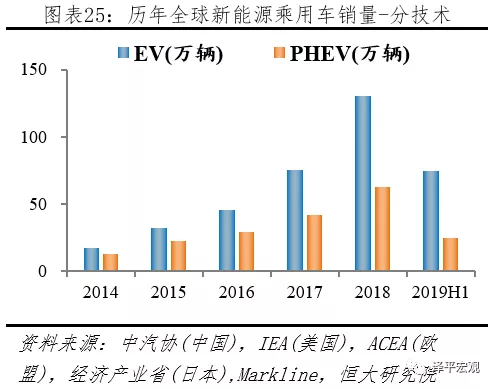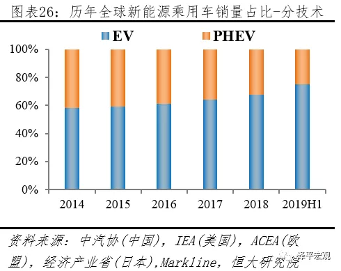 2019H1全球新能源乘用車市場EV占比3/4,份額持續(xù)提升。2019H1新能源乘用車市場,據(jù)中汽協(xié)披露,中國EV、PHEV分別銷售44.0、12.3萬輛;據(jù)ACEA披露,歐盟EV、PHEV分別銷售12.5、7.2萬輛;據(jù)Markline披露,美國EV、PHEV分別銷售10.6、3.1萬輛,日本EV、PHEV分別銷售1.1、0.7萬輛,其它地區(qū)EV、PHEV分別銷售6.2、1.2萬輛。按上述統(tǒng)計,2019H1全球新能源乘用車市場,EV、PHEV分別銷售74.4、24.6萬輛;EV市場份額從2014年58.4%提升到2019上半年75.2%。