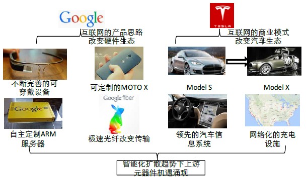 從近幾年的趨勢(shì)看,互聯(lián)網(wǎng)以及移動(dòng)互聯(lián)網(wǎng)正不斷的改變傳統(tǒng)產(chǎn)業(yè)的發(fā)展路徑。因此,2014年以及之后的電子產(chǎn)業(yè)創(chuàng)新驅(qū)動(dòng)力,將不僅僅局限于傳統(tǒng)的硬件產(chǎn)品廠商。2014年產(chǎn)業(yè)創(chuàng)新的龍頭或許將集中在谷歌與特斯拉的身上。谷歌代表了用互聯(lián)網(wǎng)的行為來(lái)改變傳統(tǒng)終端,特斯拉則是以互聯(lián)網(wǎng)的思維來(lái)改變傳統(tǒng)產(chǎn)業(yè)。