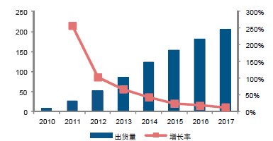 圖6:2010-2017全球智能電視出貨量(百萬(wàn)臺(tái))