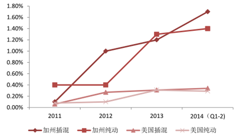 美國、加州純動、插混新能源汽 車滲透率