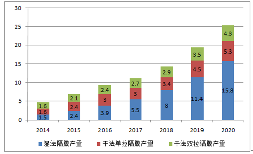 2014-2020 年鋰電池隔膜產(chǎn)量預(yù)測(億平方米 )