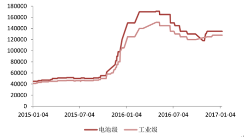 電解液:成本下降, 三元動力型電解液比例將增多 。電解液主要原材料(成本占 40%左右)六氟磷酸鋰新增產(chǎn)能將于 2017 年陸續(xù)釋放,價格下降成為趨勢,電解液成本將下降。