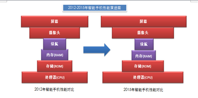 手機已經從通信終端演變成為移動互聯網終端,用戶對手機的功能的需求、對手機體驗的需求也在不斷變化。手機從以打電話、發短信、看內容為主,演變成為交互應用為主;用戶對手機體驗的需求,從信號好、待機長,演變成為網速快、運行快、拍照好等。但遺憾的是,手機技術的發展卻很不均衡,有的發展太超前,有的卻一直拖后腿,使得手機產品一直存在明顯的體驗瓶頸,一些瓶頸甚至快成為壓垮手機行業乃至移動互聯網行業發展的致命因素了。下圖是我制作的近三年(2012-2015)手機主要配置和性能演進圖: