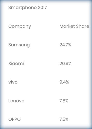 下圖數據顯示,2017年印度智能手機市場份額中三星排名第一,之后四席為小米、vivo、聯想和OPPO。
