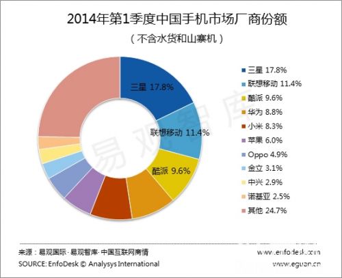 根據(jù)EnfoDesk易觀智庫的《中國手機市場季度監(jiān)測報告2014年第1季度》顯示,第1季度無論從普通手機還是智能手機市場廠商份額上來講,華為均略勝小米一籌。