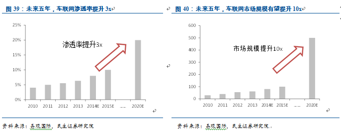 滲透率快速提升,市場規(guī)模爆發(fā)。車聯(lián)網(wǎng)有望迎來五年十倍的高景氣周期,國內(nèi)車聯(lián)網(wǎng)的滲透率從不到5%,提升至20%以上(易觀國際在汽車行業(yè)的業(yè)內(nèi)人士預測2015年我國車聯(lián)網(wǎng)用戶有望突破10%的臨界值)。以1億民用汽車保有量計算,用戶數(shù)有望從目前不到500萬上升到2,000萬以上。目前車聯(lián)網(wǎng)設(shè)備功能較為簡單,單價在1,000元左右,而隨著觸控、語音等移動互聯(lián)網(wǎng)技術(shù)融合到新型車聯(lián)網(wǎng)設(shè)備,單價有望從1,000元上升至2,000至5,000元(類似于從功能手機到智能手機的市場擴張過程)。僅車聯(lián)網(wǎng)硬件的市場空間有望從50億,跨越到500億-1,000億。此外車聯(lián)網(wǎng)服務(wù)的ARPU值有望達到1,000元/年,車聯(lián)網(wǎng)服務(wù)的年市場空間為200億以上。因此,總計市場空間至少在500億每年,是目前市場空間的十倍。