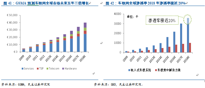 車聯(lián)網(wǎng)硬件價格下降,從高端車系向大眾車系普及。隨著移動互聯(lián)網(wǎng)設(shè)備的成熟和發(fā)展,車聯(lián)網(wǎng)硬件從過去1,000美元以上已經(jīng)降到500美元。在互聯(lián)網(wǎng)廠商介入后,相關(guān)設(shè)備的價格將繼續(xù)快速下降。此外,根據(jù)產(chǎn)業(yè)鏈調(diào)研,大多數(shù)國際整車廠已經(jīng)開始將車聯(lián)網(wǎng)預裝在大眾車系上,包括榮威、吉利等本土汽車品牌也已經(jīng)逐漸在部分車型上預裝車聯(lián)網(wǎng)系統(tǒng)。
