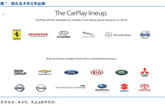 2014年3月,蘋果宣布推出車載系統Carplay,啟動后,用戶可以通過蘋果Lightning接口把iPhone連接至車輛自帶的車載娛樂系統當中。連接后,可通過觸屏、旋鈕以及語音三種方式控制包括打電話、發短信、播音樂以及及時導航等功能。據預測,首批支持CarPlay將是若干款豪華車,來自奔馳、法拉利和沃爾沃三家公司,此外,目前已與CarPlay實現合作的車企還包括寶馬、豐田、通用汽車、本田、現代、捷豹路虎、起亞、三菱、日產、標志、斯巴魯、鈴木和福特等。