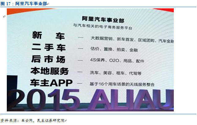 阿里成立汽車事業(yè)部,搭建全新平臺,力圖向車主提供看車、選車、買車、用車、賣車全鏈路的汽車電商服務(wù)。2015年4月,阿里宣布成立汽車事業(yè)部,由原天貓汽車、淘寶汽車、汽車O2O三個(gè)團(tuán)隊(duì)合并而成,未來將以“車主+”戰(zhàn)略為中心建立一個(gè)新的平臺,并與負(fù)責(zé)大數(shù)據(jù)營銷的阿里媽媽、汽車金融的螞蟻金服以及汽車生態(tài)產(chǎn)業(yè)鏈各方協(xié)同合作,力圖向車主提供看車、選車、買車、用車、賣車全鏈路的汽車電商服務(wù)。