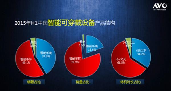 2015年上半年中國智能可穿戴設備的產品結構從銷額來看,手環占比50%,智能手表37.3%,其他的可穿戴只有3.6%左右的份額。從銷量來看智能手環78.9%,手表占到20%左右。從待機時間來看,待機在6天以下占比34.2%,6天至30天的產品占比61.3%左右,30天以上僅占 4.5%。