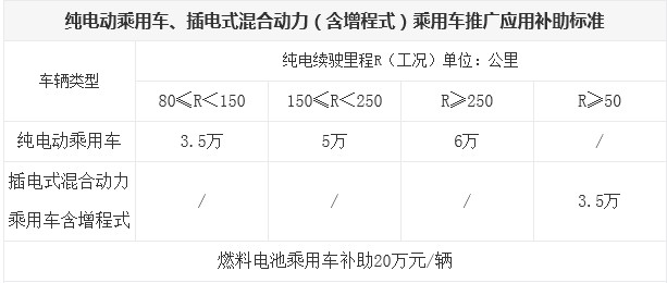 新的補貼政策是以在電力驅動下行駛的里程為指標,新規定指出,乘用車以純電行駛里程(R)為標準,插電式混合動力乘用車(含增程式)R≥50每車補貼3.5萬元,純電動乘用車80≤R<150每車3.5萬、150≤R<250每車5萬、R≥250每車6萬元。新的補貼公告附表中,特別提到了燃料電池乘用車(補貼20萬)和燃料電池商用車(補貼50萬)的補助標準。